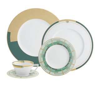 En la época de oro del movimiento Art Déco, los metales y las piedras preciosas eran elementos habitualmente asociados a la geometrización de los motivos, reflejando una opulencia inherente a la creación artística. Las piezas de la vajilla Emerald, ricamente decoradas en oro mate y verdes profundos, sustituyen el exceso por la elegancia, recreando con modernidad– a partir de piezas originales de la marca, de los años 30 – la exuberancia característica del periodo.