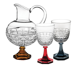 Copa con Pie Rojo Empório. En este conjunto intemporal - en el que debido a la dificultad de ejecución de las piezas, esta solamente es conseguida por los más eximios maestros cristaleros - se destaca el talla inspirada en los elementos arquitectónicos de las cúpulas, que le dan un efecto de lupa, y los colores atrevidos, que le aportan una fascinación adicional.