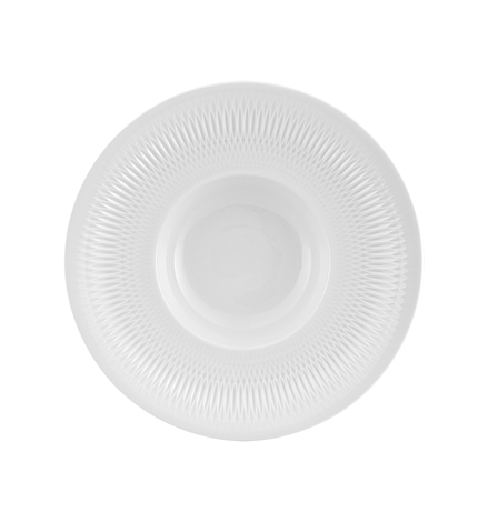 Soup Plate Utopia. Each piece of the set Utopia displays a construction of different reliefs inspired by Japanese geometries which adapts to the shape, highlighting each piece and giving it momentum.