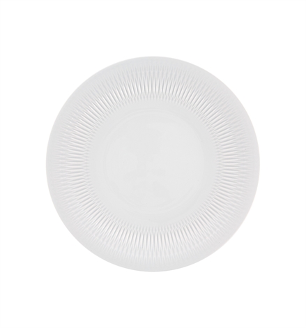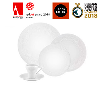 Dinner Plate Utopia. Each piece of the set Utopia displays a construction of different reliefs inspired by Japanese geometries which adapts to the shape, highlighting each piece and giving it momentum.