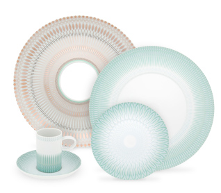 Soup Plate Venezia. The sophistication of the forms and the platinum decoration contrast with the delicacy of the relief, finished with a touch of colour in degradé.